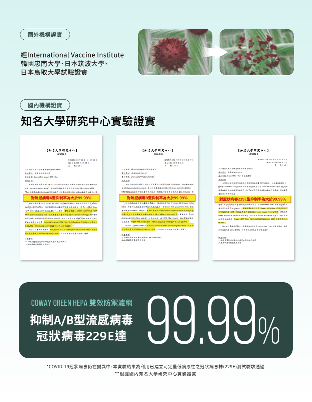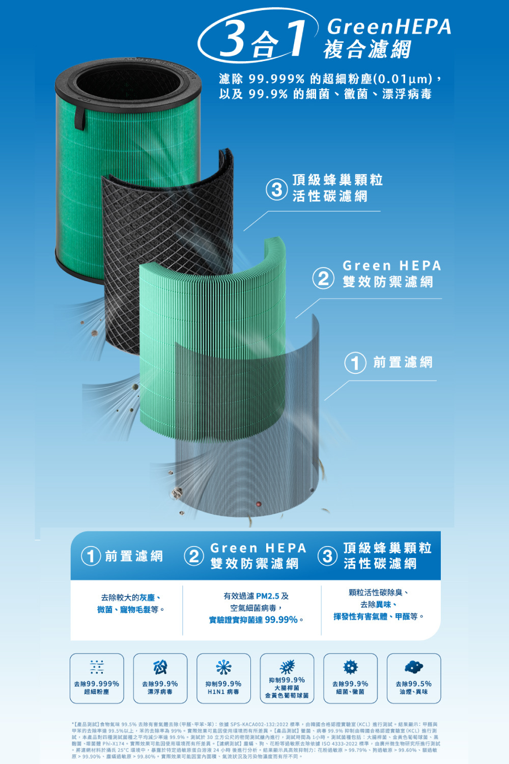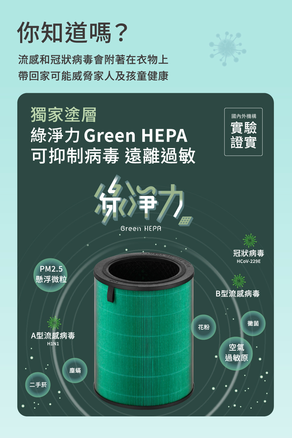 3.Green HEPA 濾網,有效抑制流感與H1N1病毒