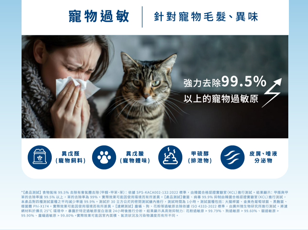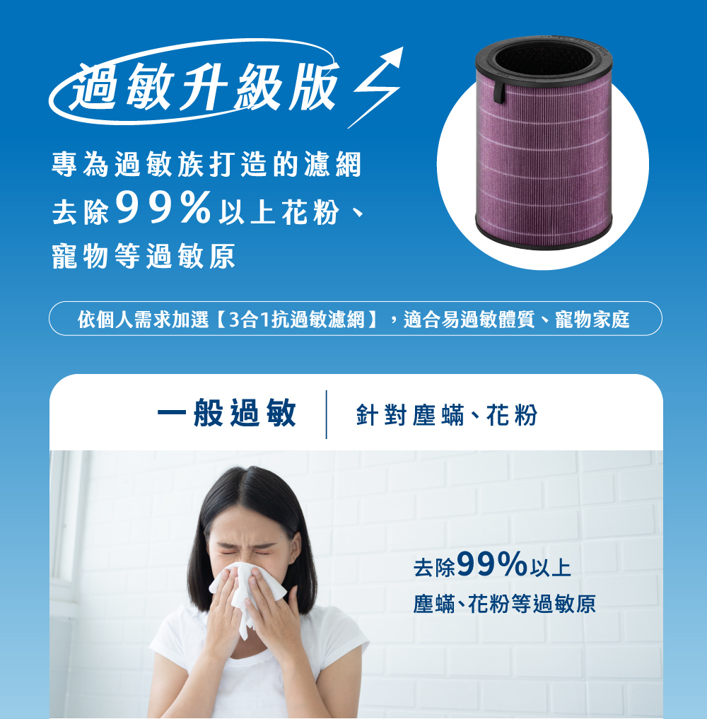4.可選配抗敏濾網,高效過濾粉塵與寵物過敏原達99.5%