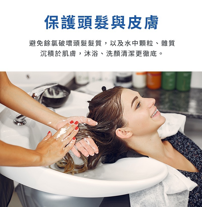 避免餘氯破壞頭髮髮質,以及水中顆粒、雜質沉積於肌膚,沐浴、洗顏清潔更徹底