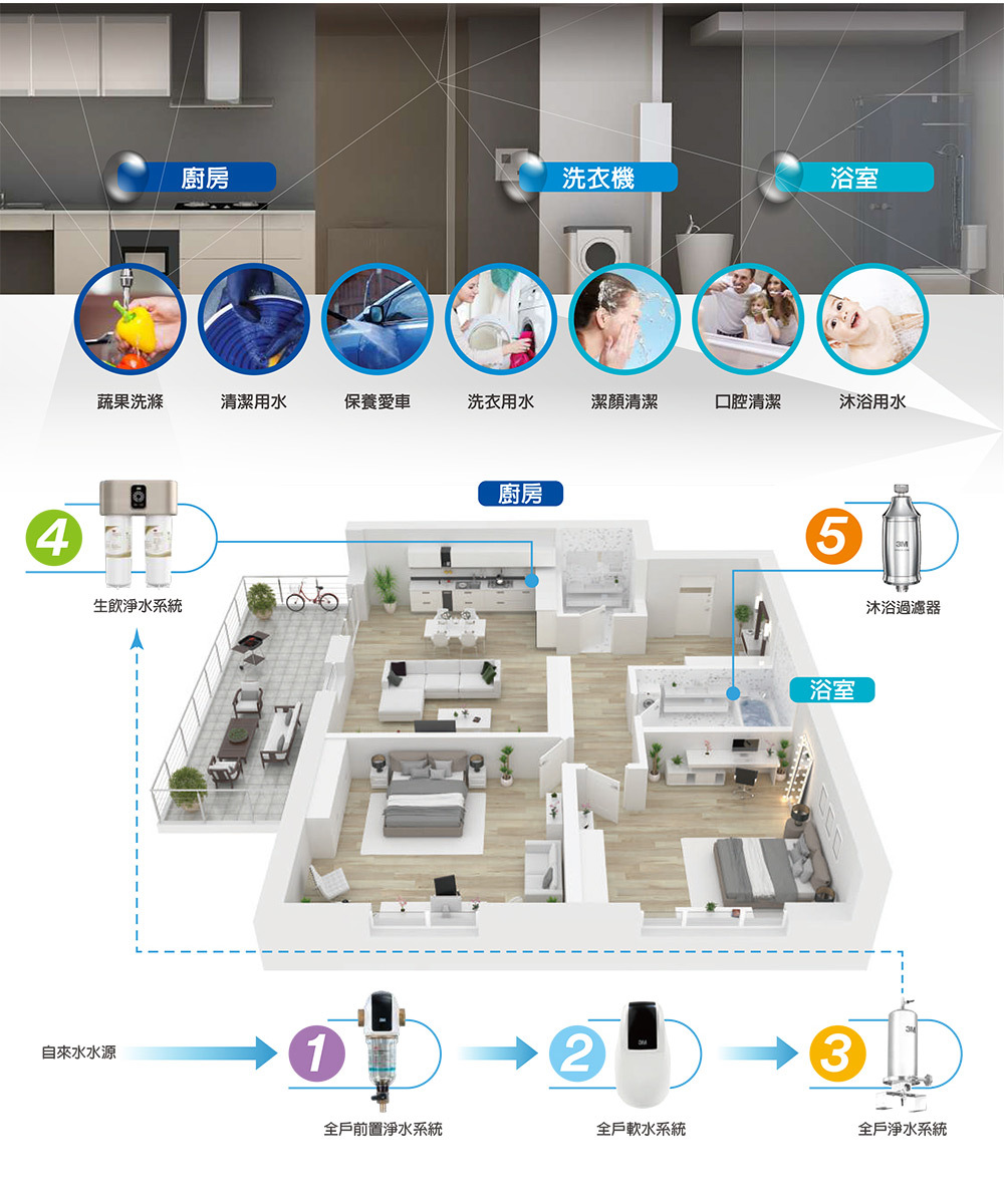 ◆濾淨每一滴用水-盥洗、沐浴、廚房、洗衣,每滴用水都經過濾