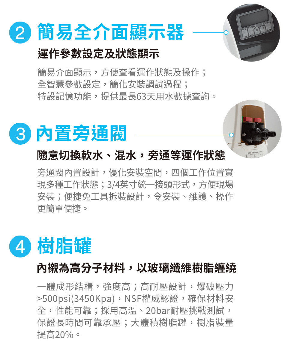 ◆美國原裝進口閥頭,時間與流量雙控制設定。持久安全的提供軟水。內置旁通閥,滿足不同需求多重用水組合。