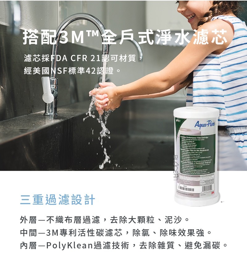 避免餘氯破壞頭髮髮質,以及水中顆粒、雜質沉積於肌膚,沐浴、洗顏清潔更徹底