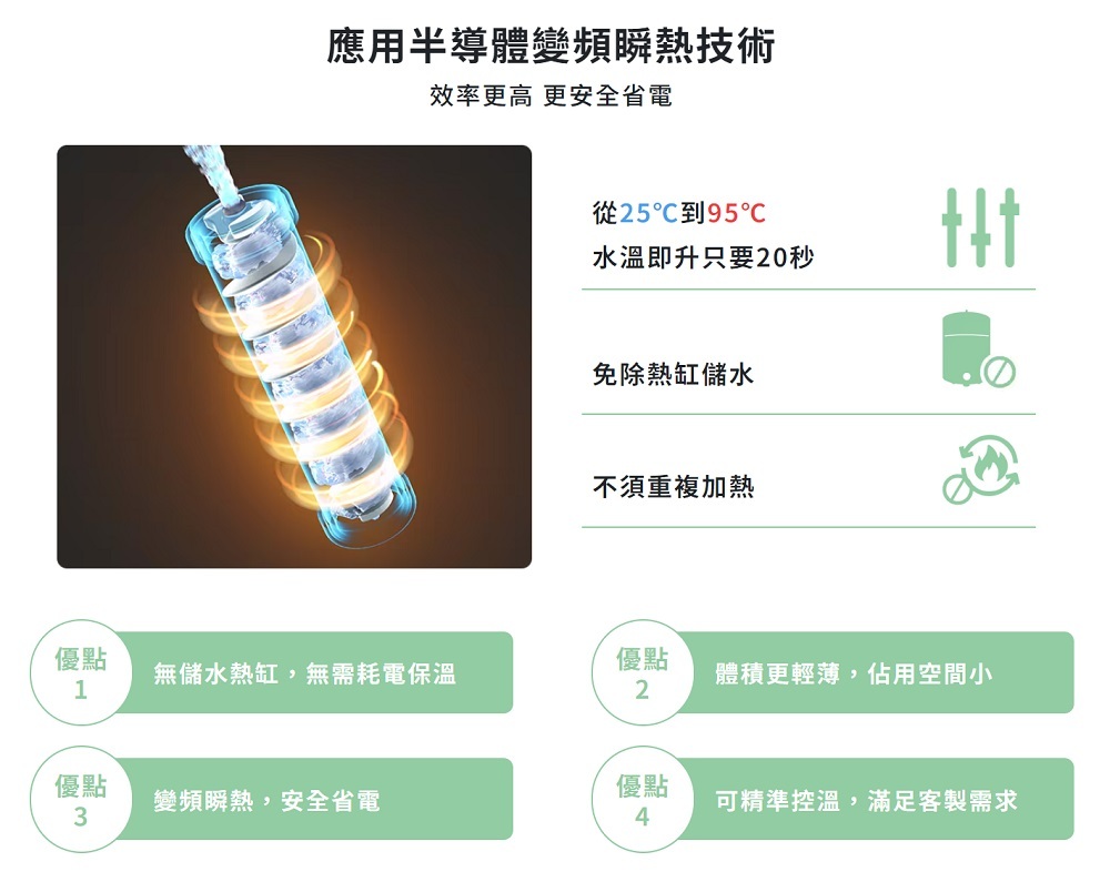 1. 瞬間加熱功能,免除熱缸與熱水重複加熱,節能省電